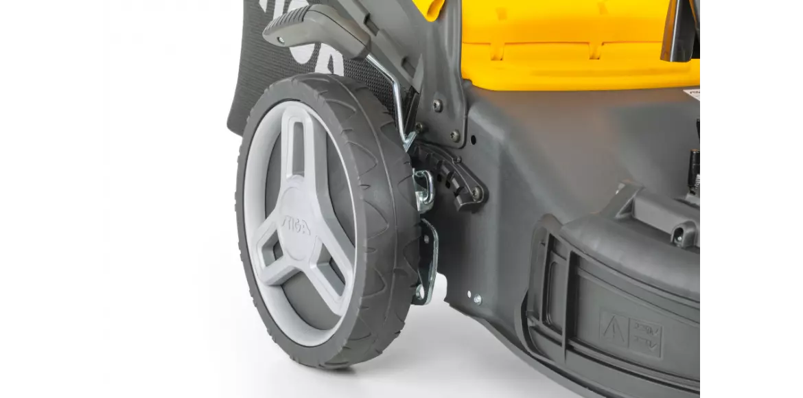 Dzięki dźwigni umieszczonej na kole wysokość koszenia można szybko ustawić w 6 pozycjach, od 22 do 65 mm.