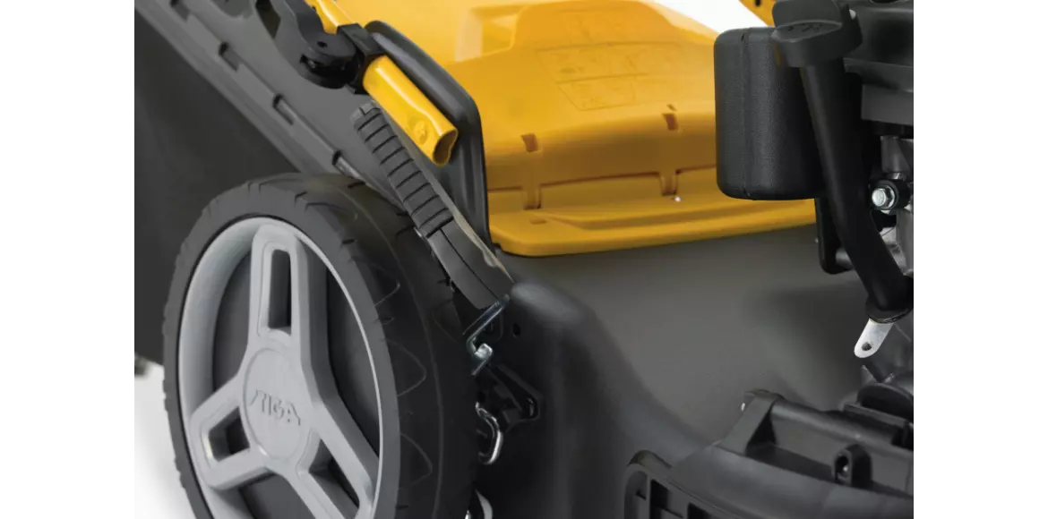 Dzięki dźwigni umieszczonej na kole wysokość koszenia można szybko ustawić w 6 pozycjach, od 22 do 80 mm.