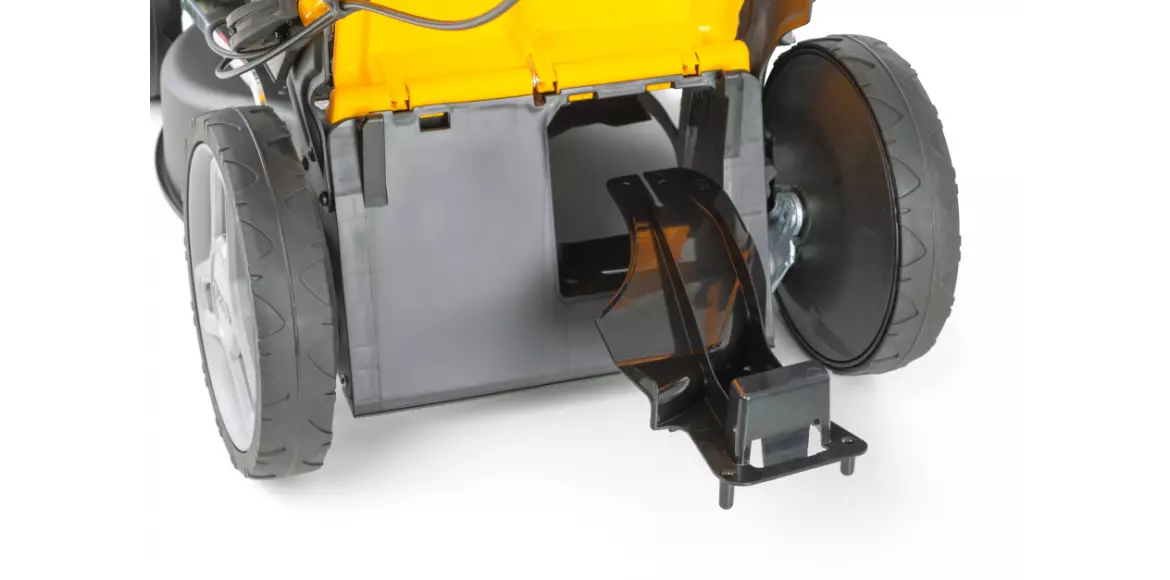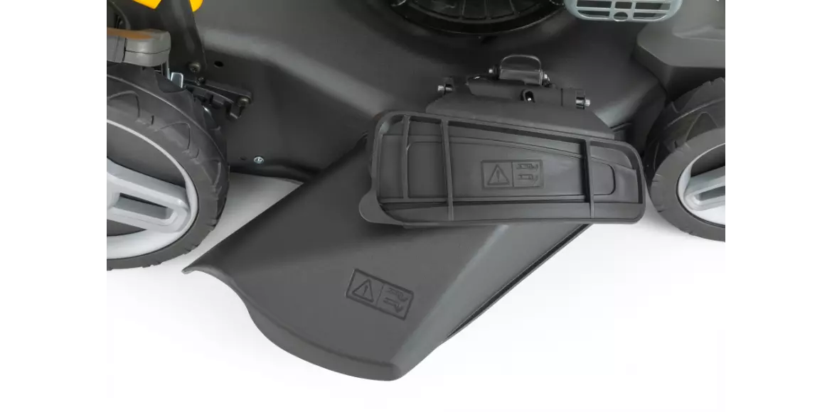 Kosiarka obsługuje funkcję mulczowania. Wystarczy wyjąć kosz i włożyć zaślepkę do mulczowania.
