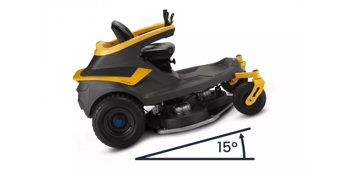 Zasilana akumulatorowo, energooszczędna i bezpieczna kosiarka STIGA Gyro 900e to jedyna kosiarka z joystikiem typu drive-by-wire z opatentowaną przez STIGA technologią Direct Drive. Podwójne niezależne przekładnie elektryczne, po jednej dla każdego koła, pozwalają maszynie na uzyskanie promienia skrętu 0º a zakres manewrowania wynosi 360º, umożliwiając koszenie bez wysiłku wokół drzew, krzewów, klombów i ozdób ogrodowych oraz maksymalną kontrolę nad kierunkiem, manewrowaniem kierownicą i prędkością. Ma wytrzymały system tnący o wielkości 125 cm, wyposażony w trzy swobodnie obracające się ostrza – każde napędzane silnikiem o mocy 1,5 kW, aby zapewnić najlepszą wydajność. Dzięki tym nowym ostrzom, zaprojektowanym i stworzonym przez STIGA, Gyro zapewnia najlepsze w swojej klasie wyniki – zarówno w trybie wyrzutu tylnego, jak i mulczowania. Agregaty koszące można regulować w ośmiu różnych pozycjach za pomocą przycisku na pulpicie. Dzięki inteligentnym trybom koszenia i trybom jazdy STIGA możesz wybrać trzy ustawienia prędkości ostrza od 2800 do 3200 obr./min. i trzy tryby jazdy od 4 km/h do 13 km/h w zależności od potrzeb i stylów koszenia. Zaprojektowany z myślą o ogromnych trawnikach model STIGA Gyro 900e może skosić do 13 000 m² powierzchni przy minimalnym hałasie i wibracjach. Dzięki dokładnie przemyślanemu rozkładowi masy oraz bardzo nisko położonemu środkowi ciężkości (zaledwie 55,3 cm nad ziemią) Gyro 900e zachowuje się niezwykle stabilnie także na nachyleniach do 15°. Bezpieczeństwo dodatkowo zwiększają ograniczenia prędkości i hamulec bezpieczeństwa, aby zapewnić błyskawiczną reakcję w przypadku sytuacji awaryjnej. Komfort nie ma granic dzięki wysokiej jakości siedzisku z wysokim oparciem, niezakłóconemu dostępowi i szerokiemu podnóżkowi. Podwójny równoległy układ zawieszenia, który pochłania drgania na wyboistym podłożu, czyni jazdę bardziej komfortową. Wszystkie komendy elektryczne są w zasięgu ręki, więc zawsze masz pełną kontrolę.