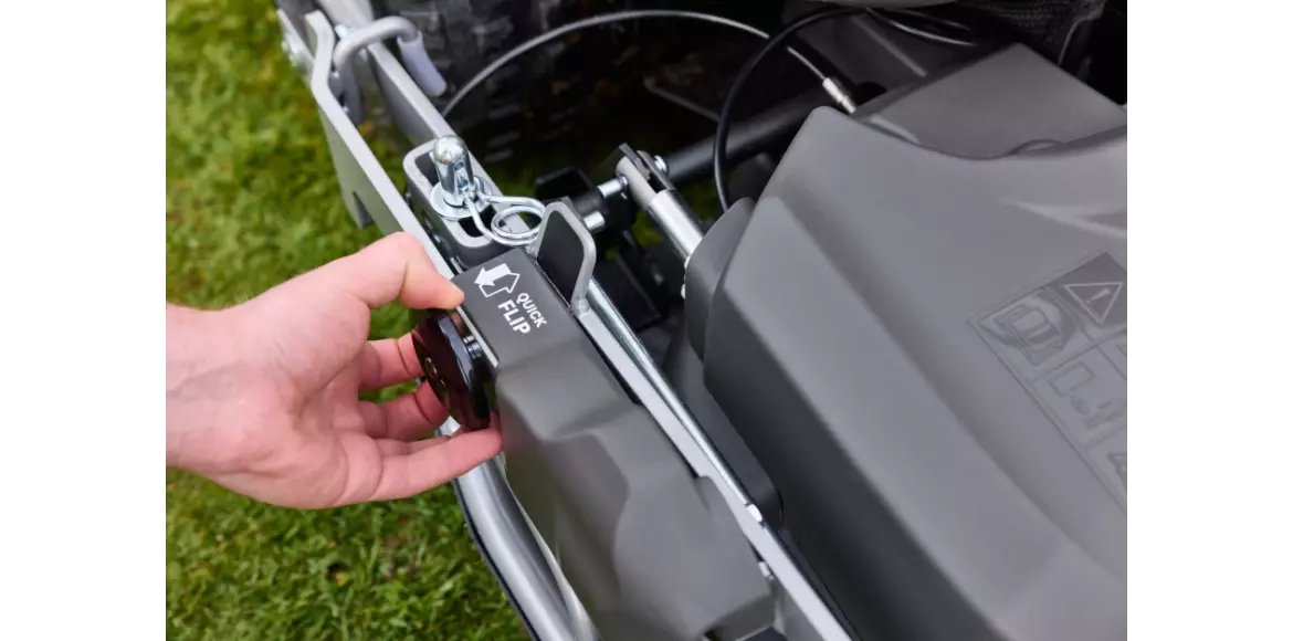 Agregat tnący montowany z przodu maszyny zapewnia doskonałą widoczność, koszenie i bardzo łatwy dostęp dzięki mechanizmowi Quick Flip