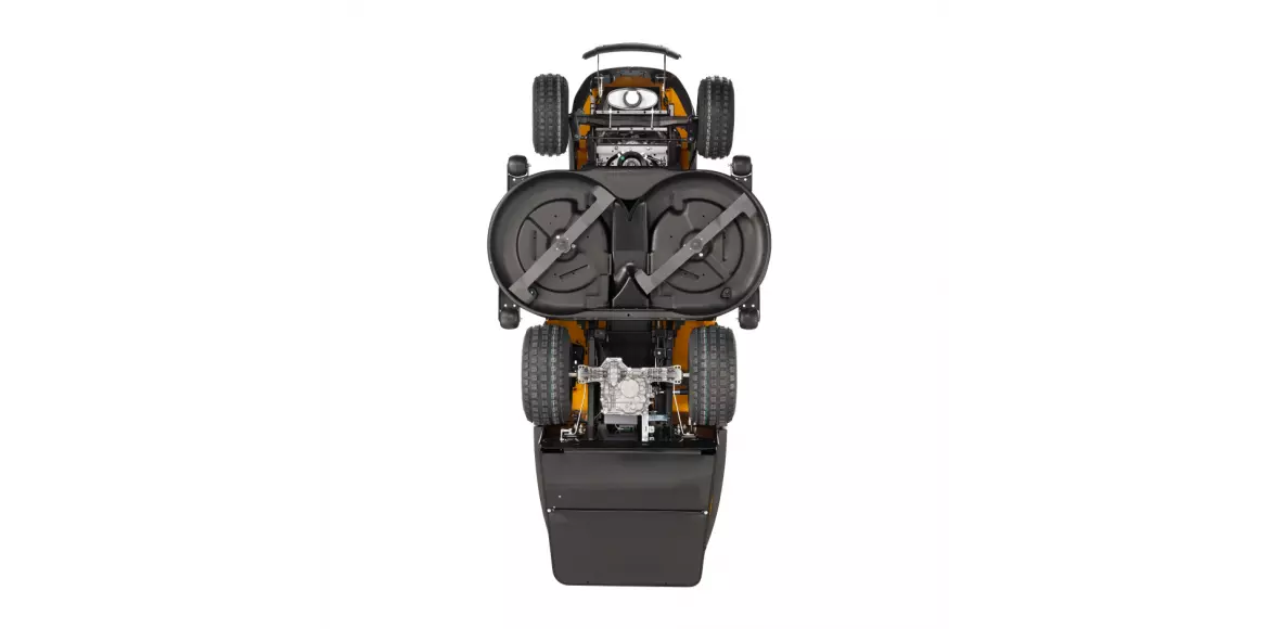 Agregat tnący ma dużą szerokość 122 cm i jest wyposażony w dwa zsynchronizowane ostrza, które optymalizują wydajność zbierania trawy. Włączenie noży jest elektromagnetyczne, a wysokość koszenia możesz wybrać spośród siedmiu różnych pozycji.