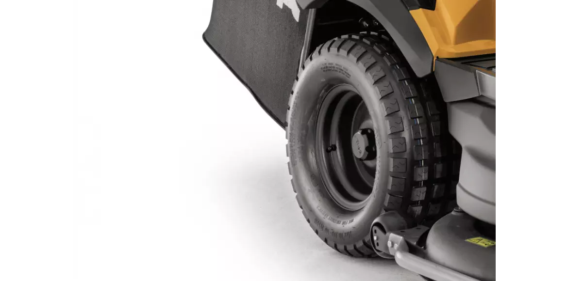 Napęd na cztery koła oznacza, że traktor może się poruszać po zboczach i po nierównym, błotnistym podłożu bez wpadania w poślizgi i buksowania. Duże tylne koła 20 calowe zapobiegają uszkodzeniom darni na delikatniejszych powierzchniach i zapewniają płynną jazdę traktora na trudnym terenie.
