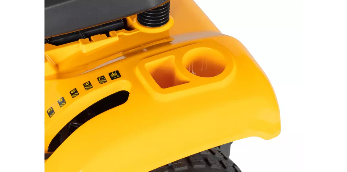 Traktor ogrodowy jest wyposażony w schowek i uchwyt na kubek.