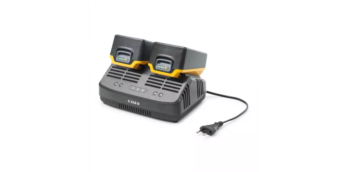 Podwójna standardowa ładowarka C 215 D, kompatybilna ze wszystkimi akumulatorami 20 V. Prąd ładowania 2 A, standardowa prędkość ładowania z dwoma gniazdami do ładowania. Wyposażona we wtyczkę UE.