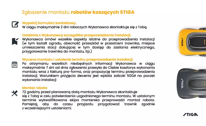 Gdy masz pod opieką duży ogród, zaplanowanie odpowiedniego reżimu cięcia oraz pogodzenie koszenia z normalnym użytkowaniem ogrodu nie powinno przysparzać Ci siwych włosów na głowie. STIGA A 5000 to robot koszący zaprojektowany z myślą o najwyższej dokładności, dlatego ma najlepsze parametry techniczne w całej rodzinie. Inne roboty są narażone na gubienie sygnału oraz zakłócenia powodowane przeszkody w obszarach zabudowanych, tzn. trzeba ręcznie interweniować w celu umożliwienia im dokończenia pracy. Dla odmiany STIGA A 5000, wyposażony w unikatową, opatentowaną przez STIGA technologię aktywnego prowadzenia Active Guidance System (AGS) polegającą na ustawicznej komunikacji ze stacją referencyjną przez łącze 4G, zapamiętuje jakość sygnału o różnych porach dnia i inteligentnie planuje swoją pracę w celu uzyskania jak najlepszych rezultatów. STIGA A 5000 dokładnie wie, kiedy, gdzie i jak ciąć trawę w celu utrzymania dobrej kondycji zdrowotnej trawnika. Instalacja odbywa się w pełni wirtualnie, tzn. granice strefy roboczej można ustawić za pomocą aplikacji. Poproś dealera o radę przy pierwszej instalacji. Jeśli układ ogrodu ulegnie zmianie, wystarczy otworzyć aplikację STIGA.GO i podać robotowi STIGA A 5000 nowe informacje. Wyposażony w nasz akumulator STIGA ePower o długim czasie pracy robot koszący STIGA A 5000 może niezawodnie kosić trawnik o powierzchni do 7000 metrów kwadratowych w zaledwie dwóch sesjach koszenia dziennie Następna sesja zawsze rozpocznie się tam, gdzie zakończyła się poprzednia, dzięki czemu robot może dbać o całą powierzchnię, kosząc codziennie w różnych strefach. Aby zachować zdrowie trawnika, zalecamy zaplanowanie tylko 2 sesji cięcia dziennie; jednak harmonogram jest w pełni elastyczny. Każdy element robota STIGA A został starannie przemyślany: sześć ostrzy, przymocowanych do koła wirującego z prędkością 2400 obr./min, zapewnia najwyższą efektywność koszenia. Ostrza mogą się swobodnie obracać, dlatego w razie kontaktu ze stałym obiektem natychmiast się chowają, aby zminimalizować zniszczenia. Ostrza wykuto ze specjalnego stopu metalu gwarantującego zachowanie ostrości krawędzi. W mało prawdopodobnym przypadku uszkodzenia ostrza prosty układ zamocowania agregatu koszącego bardzo ułatwia wymianę. W wolnej chwili przejrzyj funkcje dostępne w aplikacji. Możesz tam dodawać ustawienia różnych wysokości koszenia, zakazy wjeżdżania do określonych miejsc o określonych godzinach oraz wykluczanie stref z sesji koszenia. W celu uzyskania jak najlepszej kondycji trawnika włącz funkcję ścieżki koszenia z ochroną trawy, która regularnie zmienia trajektorię ruchu maszyny. Ustaw strefy wykluczenia oraz zakazy zbliżania w określonych porach, a STIGA A 5000 zapamięta, kiedy i gdzie może kosić. Możesz także zintegrować robota z asystentem głosowym i wtedy wydawać polecenia mówione. Dla utrzymania dobrej kondycji Twojego robota należy regularnie czyścić go w sposób wskazany w instrukcji obsługi. Zdejmowany beznarzędziowo korpus górny oraz klasa ochrony IPX5 ułatwi to zadanie. Robot jest sprzedawany w komplecie z darmowym, dożywotnim pakietem łącznościowym, który umożliwia pracę i komunikację. Korzystanie z pełnej funkcjonalności produktu wymaga zainstalowania aplikacji STIGA.GO. Nabywca ma obowiązek aktualizowania aplikacji. Wymagania sprzętowe dla aplikacji: Android 5.0 lub nowszy iPhone Wymaga systemu iOS w wersji 11.0 lub nowszej. iPod touch Wymaga systemu iOS w wersji 11.0 lub nowszej. Mac Wymaga systemu macOS w wersji 11.0 lub nowszej oraz Maca z czipem Apple M1 lub nowszym